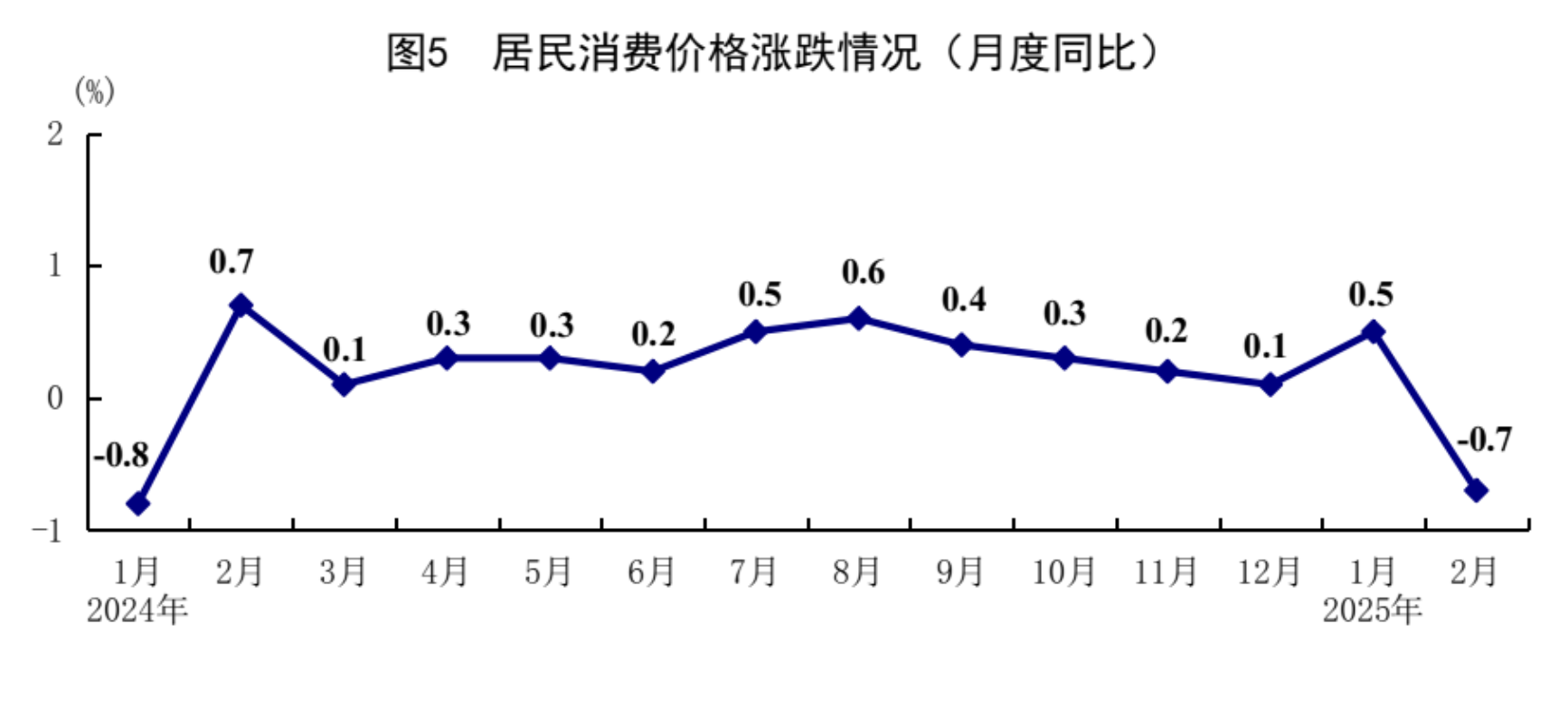 1-2月份,全国居平易近消费价钱(CPI)同比下降0。1%,此中1月份上涨0。5%,2月份下降0。7%。分类别看,1-2月份,食物烟酒价钱同比下降0。7%,栖身价钱上涨0。1%,糊口用品及办事价钱下降0。9%,交通通信价钱下降1。6%,教育文化文娱价钱上涨0。6%,医疗保健价钱上涨0。4%,其他用品及办事价钱上涨5。9%。正在食物烟酒价钱中,鲜菜价钱下降5。5%,粮食价钱下降1。4%,鲜果价钱下降0。6%,猪肉价钱上涨8。8%。扣除食物和能源价钱后的焦点CPI同比上涨0。3%。从环比看,1月份,全国居平易近消费价钱上涨0。7%,2月份下降0。2%。