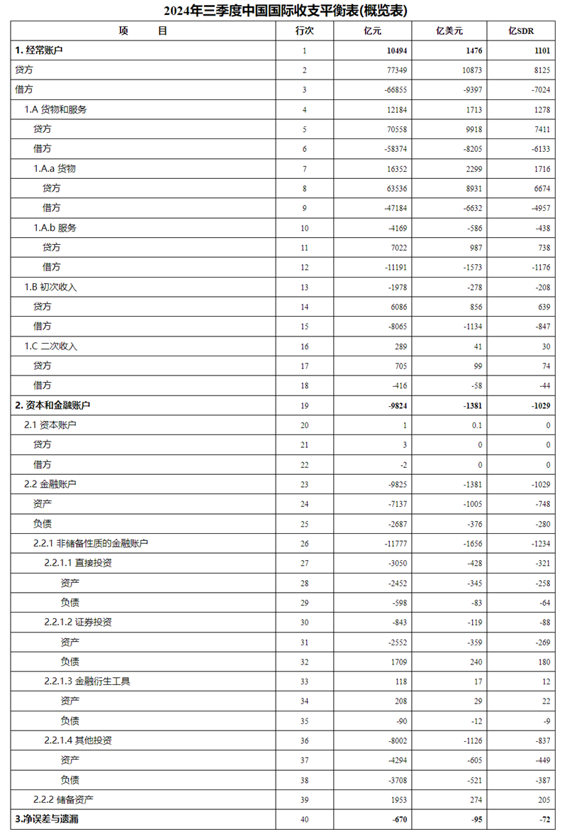 按美元计值,2024年三季度,我国经常账户顺差1476亿美元,此中,货色商业顺差2299亿美元,办事商业逆差586亿美元,初度收入逆差278亿美元,二次收入顺差41亿美元。此中,本钱账户顺差0。1亿美元,金融账户逆差1381亿美元。